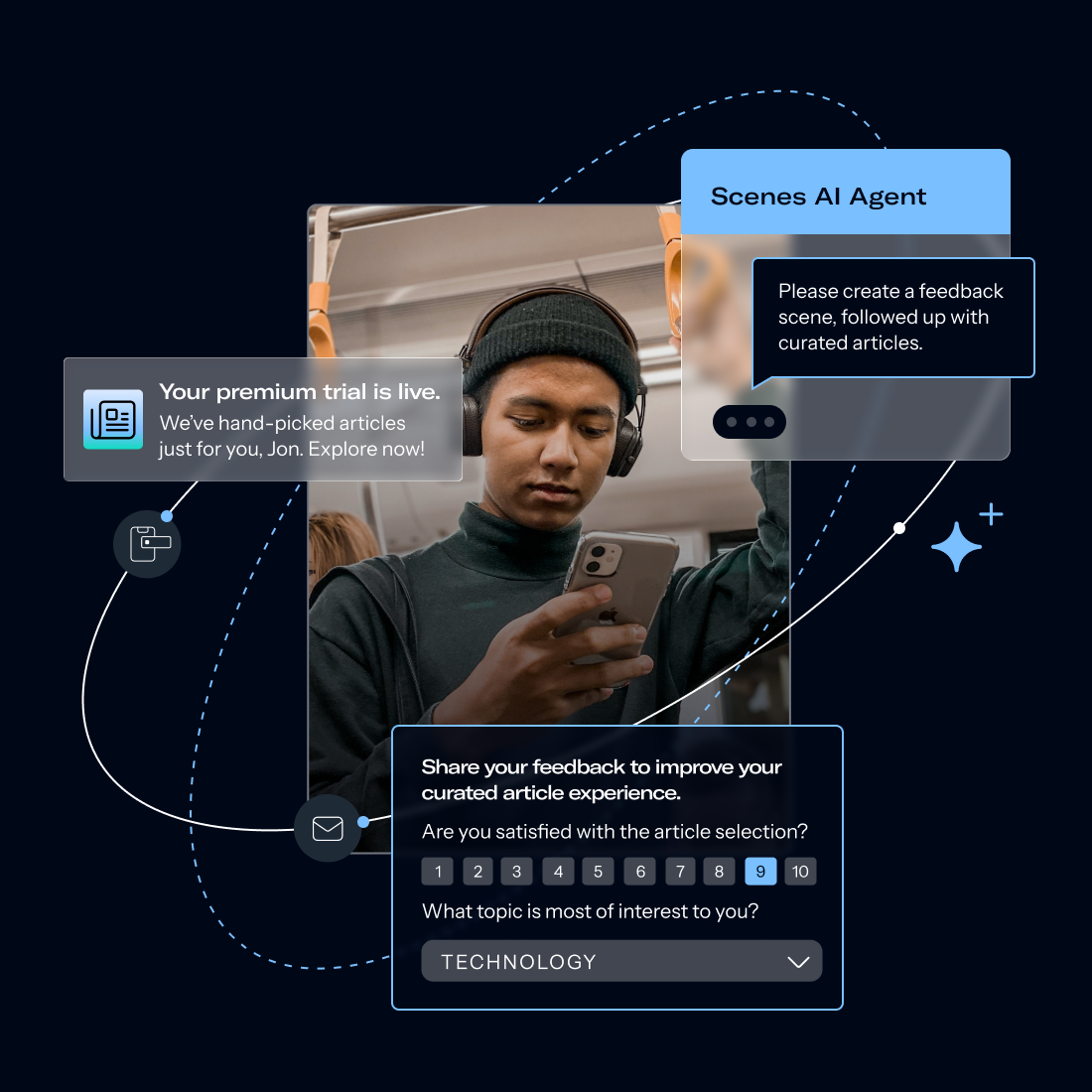 Let Airship’s Scenes AI Agent turn ideas into polished experiences that align to your brand guidelines. Create scenes for offers, onboarding, surveys, and more. Move faster — generate, adjust, and launch multi-screen experiences without delays.