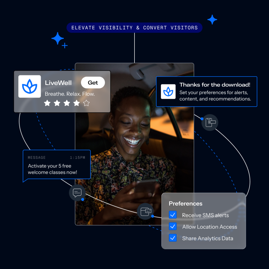 Elevate visibility in app stores while converting web visitors into identified, opted-in customers. Strengthen acquisition efficiency with mobile-first intelligence, seamless journeys, and continuous optimization.