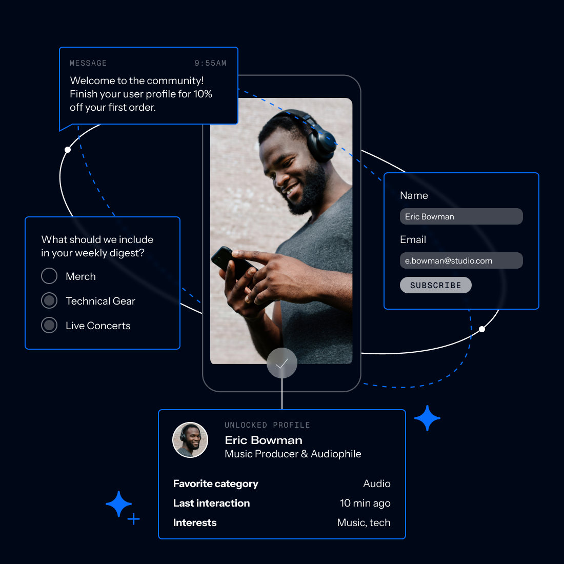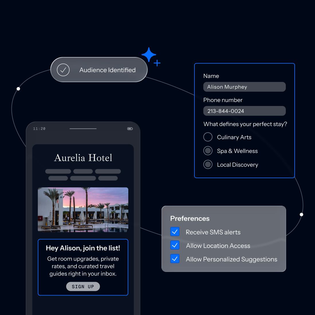Collect email, SMS, and first-party data using in-session prompts tailored to visitor behavior. Convert anonymous traffic into addressable audiences that flow naturally into activation and acquisition journeys.