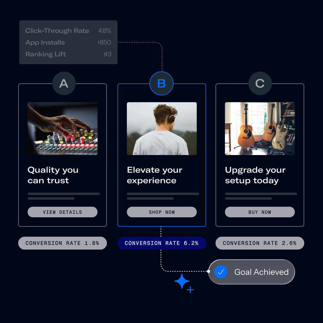 Test metadata, creatives, and web placements to understand what drives stronger results. Continuously refine both app and website touchpoints to improve efficiency and scale acquisition with confidence.