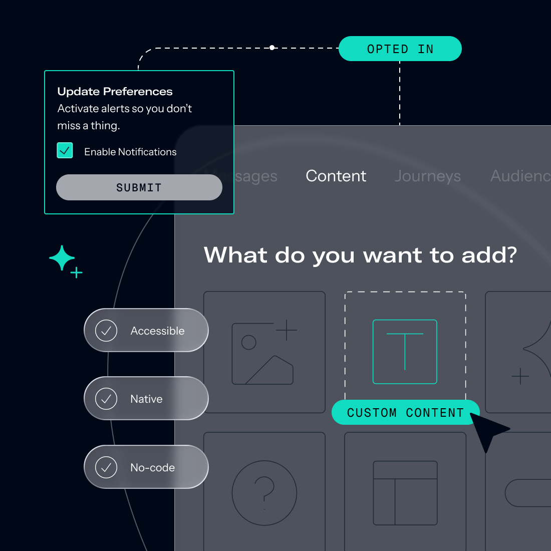 Create, manage, and update user preferences and opt-ins within Airship, giving your customers intuitive control over their app personalization experience — deciding how and where they interact with you.