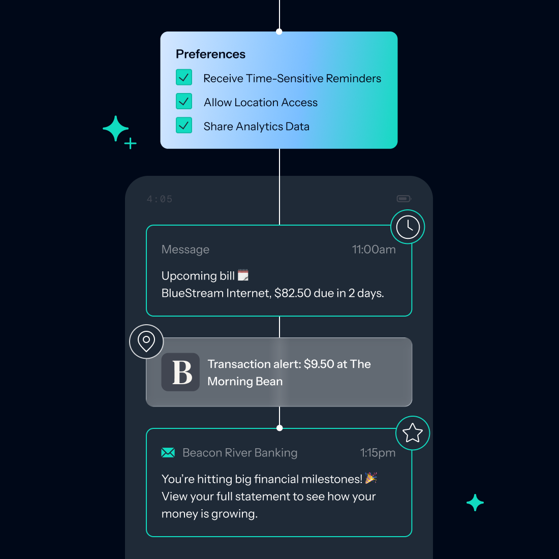 Combine behaviors, preferences, and external customer data to deliver context-rich experiences to the right audience. Create trust-building relevance through app personalization that adapts to each customer's unique journey.