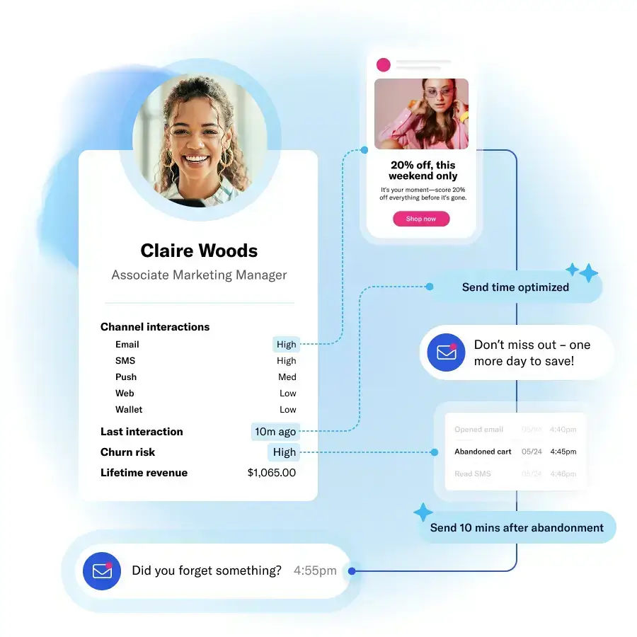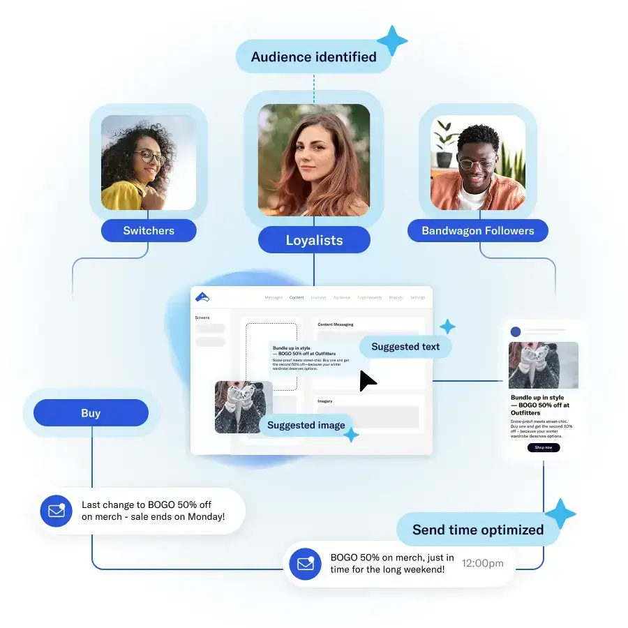 Never start from scratch again — use AI to generate content, test variants, build cross-channel journeys, and coordinate channels based on your goals.