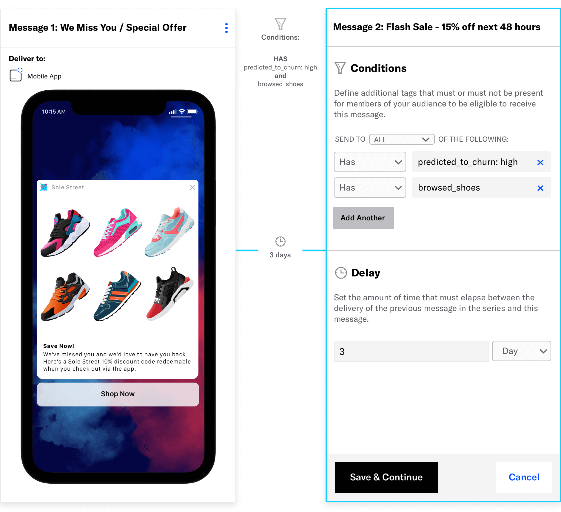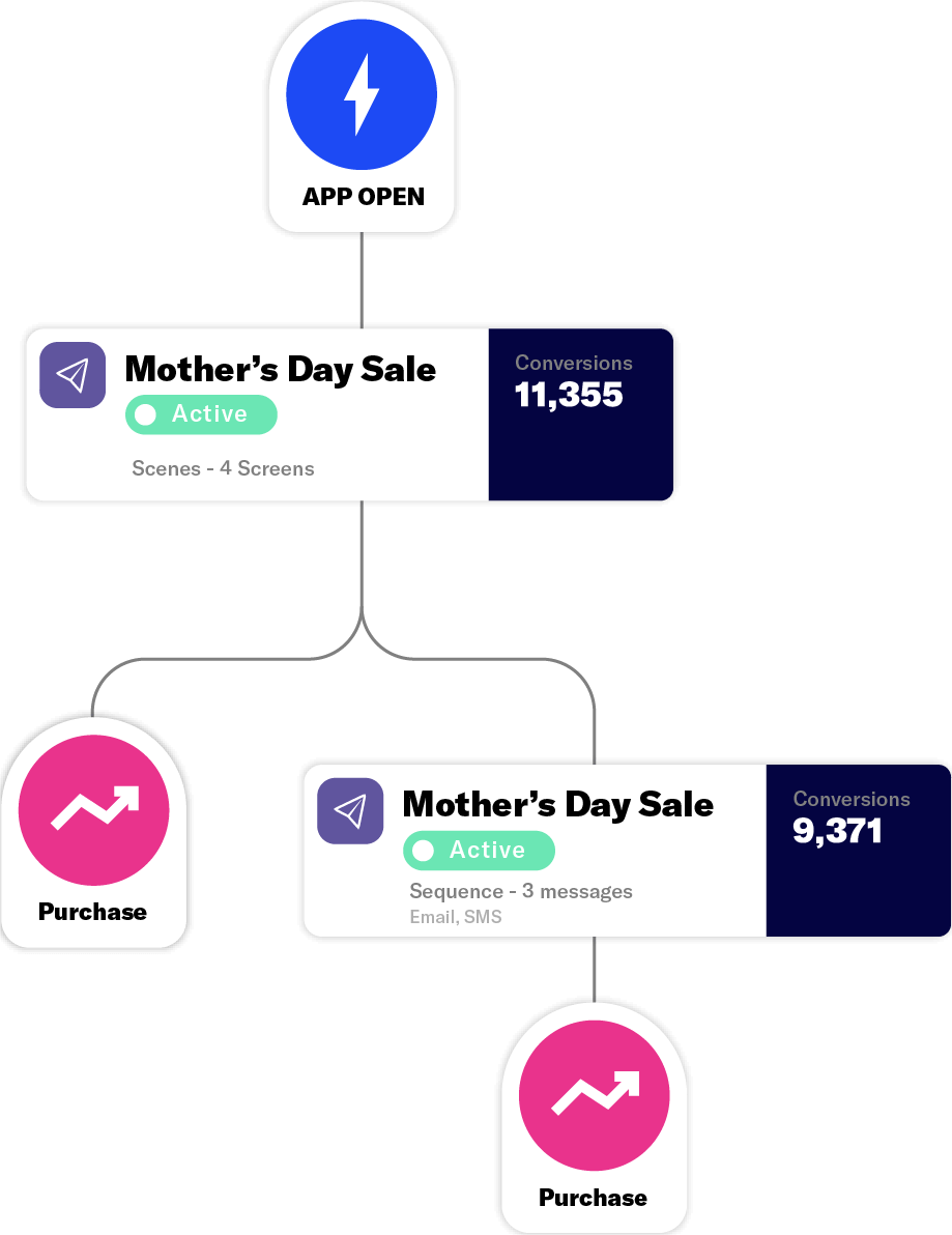 Design cross-channel journeys to ensure you send customers down the best path—From welcome messaging to purchase flows, you can configure trigger events, message delivery, and outcomes tied to your conversion goals across the lifecycle.