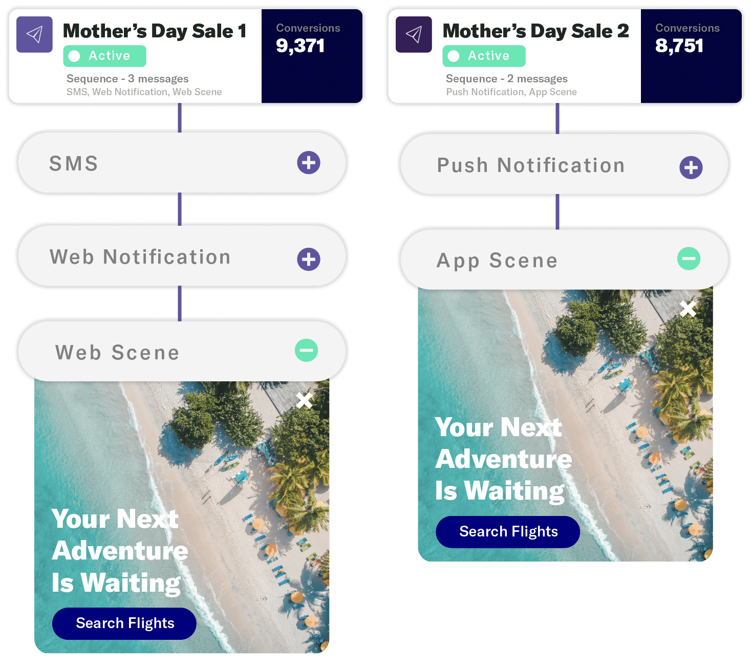 Like all Airship tools, Airship Journeys are no-code, visual, native and channel-agnostic — so you can focus on goals and conversions and not worry about syncing back-end systems.